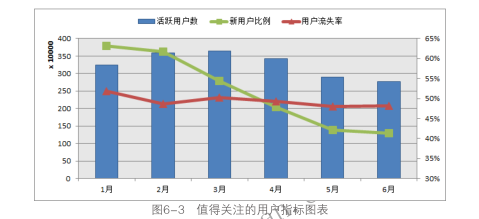 網(wǎng)站的活躍用戶數(shù)體現(xiàn)了網(wǎng)站制作當前實際掌握的用戶數(shù)量,結(jié)合新用戶比例和用戶流失率可以分析網(wǎng)站用戶的發(fā)展情況,通過這三個指標基本可以掌控網(wǎng)站用戶的全景??梢詫⑦@三個指標放在一張圖表中來分析網(wǎng)站用戶的狀況,如圖6-3所示。