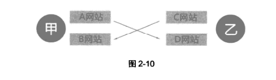 第一種是雙方均擁有兩個網(wǎng)站: 甲方擁有A、B兩個網(wǎng)站,乙方擁有C,D兩個網(wǎng)站,則甲方用A站鏈接乙方的D站,乙方用C站鏈接甲方的B站(如圖2-10所示)。
