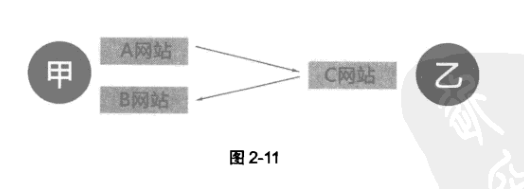 第二種是雙方共擁有三個網(wǎng)站: 甲方擁有A、B兩個網(wǎng)站,乙方擁有C網(wǎng)站,則甲方用A站鏈接乙方的C站,乙方用C站鏈接甲方的B站(如圖2-11所示)。