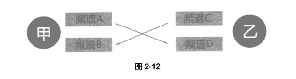 第三種是雙方各擁有一個網(wǎng)站: 甲方網(wǎng)站設(shè)計(jì)中有A、B兩個子頻道,乙方網(wǎng)站中有C,D兩個子頻道。則甲方用A頻道鏈接乙方的D頻道,乙方用C頻道鏈接甲方的B頻道(如圖2-12所示)。