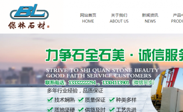 莊河市保林石材有限公司于2016年6月取得ISO質(zhì)量和環(huán)境體系認證,公司主要產(chǎn)品為板材和異型石材。板材:噴砂板、火燒板、磨光板、機刨板、外墻干掛板、樓梯踏步板、盲道板等各種板材;條石:路邊石、界石等各種規(guī)格條石;異型石材石雕:馬蹄石、擋車石球、石柱、界碑、里程碑、工程碑、欄桿、欄板、門牌石、墓園石材、園林石材等異型石材和石雕產(chǎn)品。年產(chǎn)板材30萬平,路邊石10萬延米, 可以承攬大型建筑道路、園林、公墓工程石材供貨。多年來,保林石材產(chǎn)品暢銷全國各地,享有廣大客戶較好口碑。