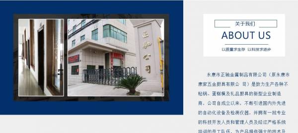 永康市正*金屬制品有限公司(原永康市康家五金廚具有限公司)是致力生產(chǎn)各種不粘鍋、蛋糕模及禮品廚具的新型企業(yè)制造商,公司自成立以來(lái),不斷引進(jìn)國(guó)內(nèi)外先進(jìn)的自動(dòng)化設(shè)備及檢測(cè)儀器,并擁有一批專業(yè)的科技開(kāi)發(fā)人員和管理人員及經(jīng)過(guò)嚴(yán)格系統(tǒng)培訓(xùn)的員工隊(duì)伍,為產(chǎn)品提供強(qiáng)大的技術(shù)及品質(zhì)保證,強(qiáng)力打造中國(guó)廚具業(yè)乃至世界廚具業(yè)的高端品牌,現(xiàn)公司產(chǎn)品已遠(yuǎn)銷國(guó)外,英國(guó)、美國(guó)等歐美發(fā)達(dá)國(guó)家地區(qū),并在同一行業(yè)中享有較高的聲譽(yù)。
